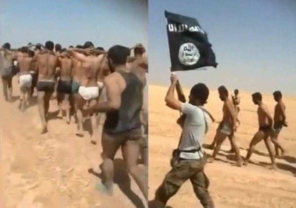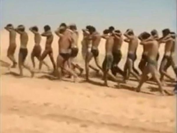 The video shows dozens of men in boxers and briefs, being marched through the desert with their hands behind their heads. Then later, the video shows piles bodies of all the men lying face down on the floor.